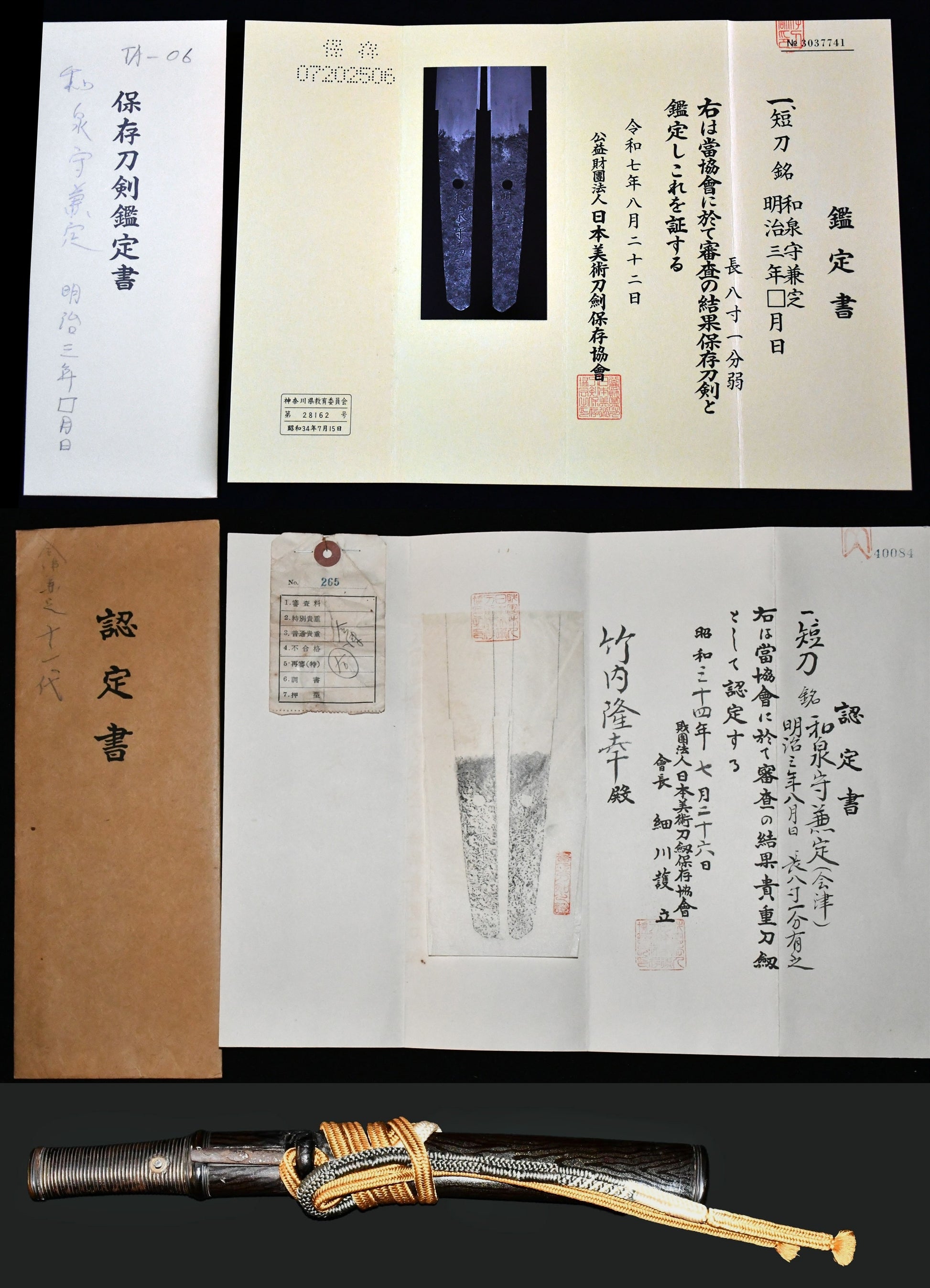短刀 和泉守兼定(会津)明治三年八月日 保存刀剣鑑定書